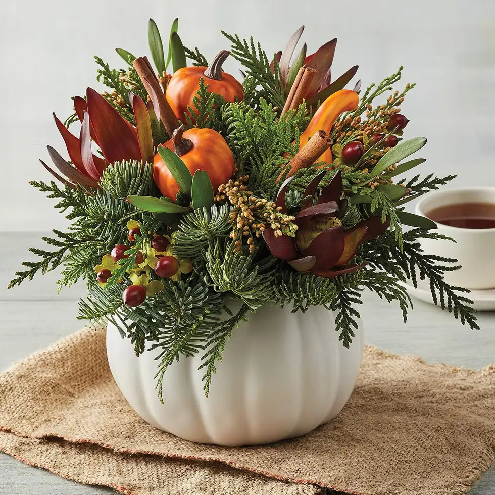 Add fall flair to your mantel or table with this elegant harvest centerpiece. Noble fir, western red cedar, incense cedar, safari sunset leucadendron, cinnamon sticks, faux gourds, and faux hypericum berries are all artfully arranged inside this delicate white ceramic pumpkin. An impressive display, this centerpiece makes a wonderful gift for someone special or a stylish addition to your own décor.